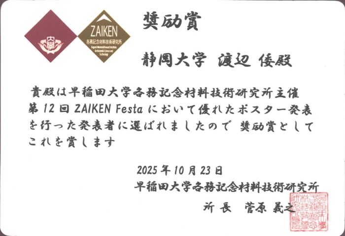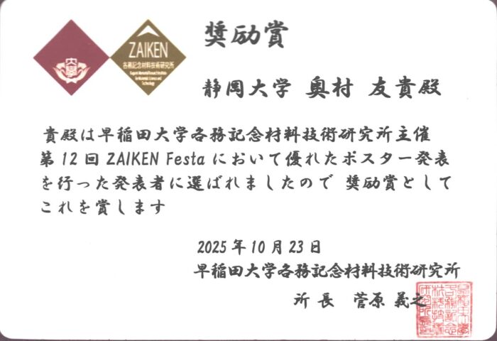 第12回 ZAIKEN Festa 2025年10月23日 2026年3月9日 早稲田大学各務記念材料技術研究所で開催された第12回 ZAIKEN Festaに奥村君と渡辺倭君が発表しました。 CNTフォレストのフィルム化TIMと熱構造関数評価奥村友貴、中野貴之、井上翼 熱構造関数によるCNTフォレストの熱輸送特性評価渡辺倭、中野貴之、井上翼 奥村君と渡辺君は、共に奨励賞を受賞しました。おめでとう! FNTG学会 M&M2025 材料力学カンファレンス