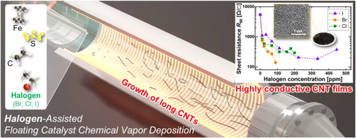 CNTを合成するプロセスに臭素などのハロゲンを添加して単層カーボンナノチューブの長尺化するとともに、CNT透明導電膜の導電性を向上させる手法に関する研究成果がCarbon誌に採択されました。この研究は、住友電気工業、フィンランドAalto大学との共同研究の成果です。