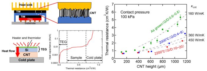 CNTフォレストの長さや結晶性を制御した試料に対し、過渡熱応答測定を行い熱構造関数を導出して、CNTフォレスト熱抵抗および半導体、金属ヒートシンクとの接触熱抵抗の挙動を明らかにしました。CNTフォレストは高性能サーマルパッドや熱伝導グリスと同程度の熱抵抗であり、化学的安定性や長期耐久性の観点から、次世代TIMとして有望であることがわかりました。また、材料の熱抵抗や界面熱抵抗を過渡熱応答と熱構造関数解析により明らかにするアプローチは世界的に新しい手法であり、今後の高性能TIM開発に向けた有効な手段になると思われます。